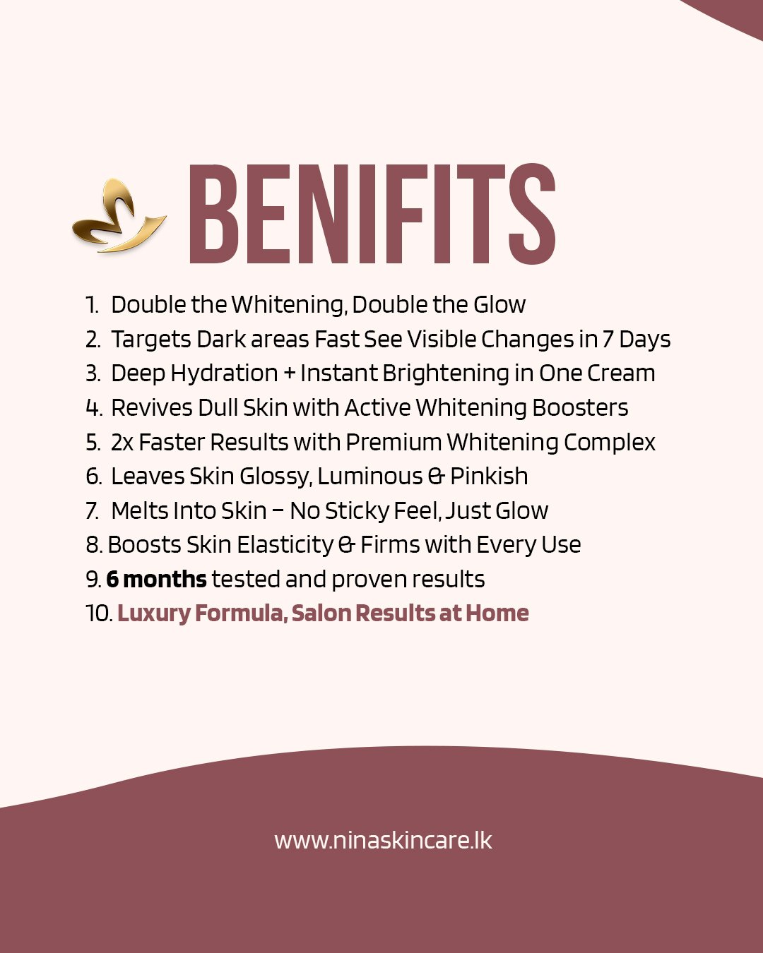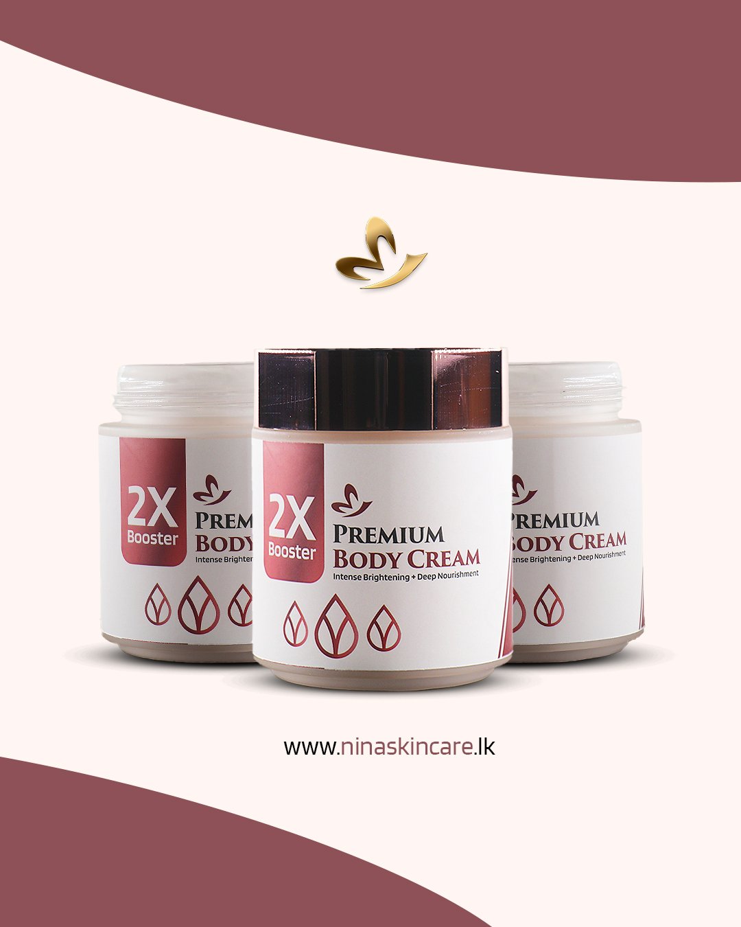 Premium Body Cream – 2X Booster • Tagline: Intense Brightening + Deep Nourishment • Highlights: • Fades Dark Spots & Hyperpigmentation • Targets Knees, Elbows, Underarms, Bikini Area • Boosted with Natural Exfoliants • Long-lasting Glow